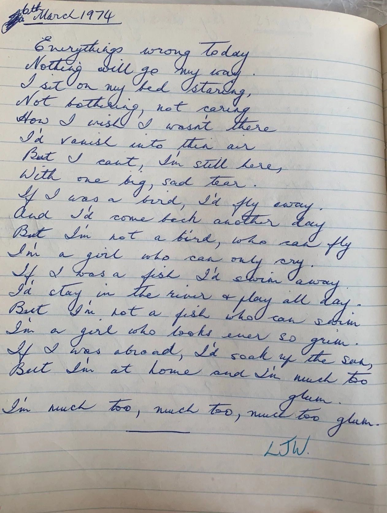 I write poems that my mum says are very good. She insists on copying them out in her neat handwriting (was mine really so dreadful?) and showing them to people. I cringe and resolve to keep them private from now on. Some days I think I’m an exceptionally talented poet, but the rest of the time I’m not so sure. I manage to ‘lose’ most of them.