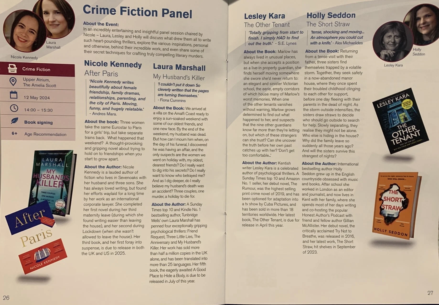 I was thrilled to take part in this year’s literary festival in my new home town of Tunbridge Wells. Stupidly, I forgot to take any photos of the amazing audience we had! It was a full house in the upstairs of The Amelia Library, which is such an inspiring and beautiful venue. The delightful Nicole Kennedy chaired a panel with authors Laura Marshall, Holly Seddon and myself and we enjoyed every minute!